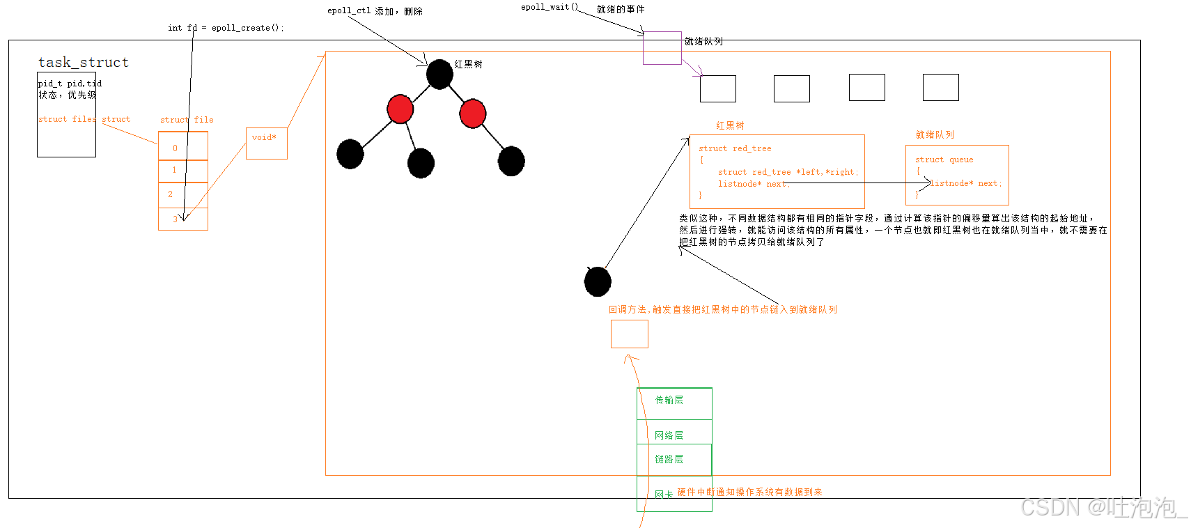 当epoll_create 返回时,返回一个文件描述符,该文件描述符会和epoll模型关联起来,epoll会在底层构建一颗红黑树和一个就绪队列,当添加新的文件描述符,就会在红黑树添加一个节点,key值为fd,删除也就是移除节点,然后在设置一个回调方法,将来比如有新的事件来了,通过回调方法判断是哪个节点的事件就绪,在把该节点直接链入至就绪队列当中,通知上层去取数据,这种就不需要进行遍历,就绪队列里的节点就是已经就绪了的事件,不需要反复进行遍历。