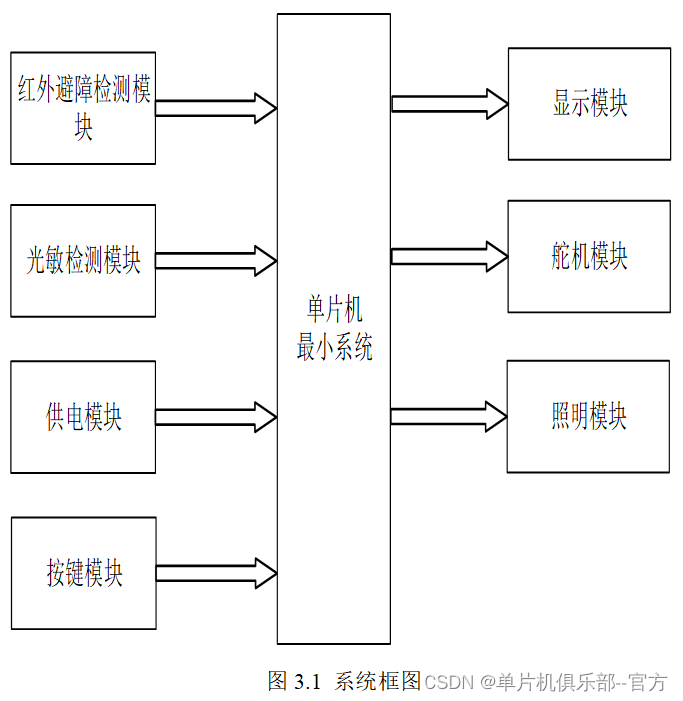 本设计以单片机为核心控制器,加上其他模块一起组成此次设计的整个系统,其中包括中控部分、输入部分和输出部分。中控部分采用了单片机控制器,其主要作用是获取输入部分的数据,经过内部处理,逻辑判断,最终控制输出部分。输入由四部分组成,第一部分是红外避障检测模块,通过该模块检测使用者的身高;第二部分是光敏检测模块,通过该模块检测当前光照值;第三部分是按键模块,通过该模块可以调整衣架的高度等;第四部分是供电模块,通过该模块可给整个系统进行供电。输出由三部分组成,第一部分是显示模块,通过该模块可以显示监测的衣架状态、灯是否打开;第二部分是舵机模块,通过该模块调节衣架的高度;第三部分是照明灯模块,该模块通过光敏检测模块检测光照低值触发红外避障自动开灯。具体系统框图如图3.1所示。