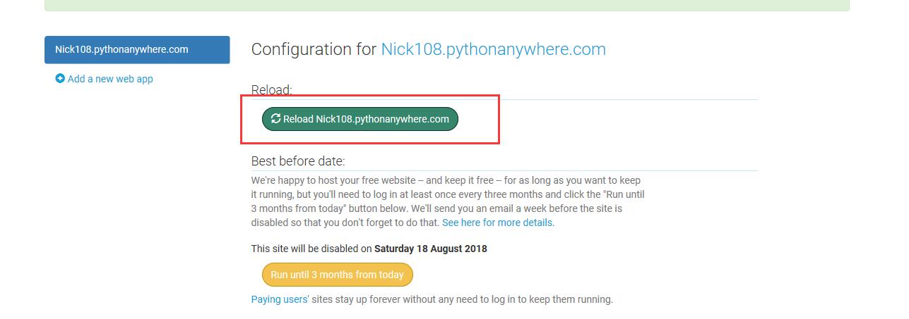到这里,我们的Django项目已经在PythonAnyWhere上了,虚拟环境也准备好了,此时就可以将它作为Web App发布了!在PythonAnyWhere里,点击 “Web”选项卡 -> 点击 “Add a new web app”