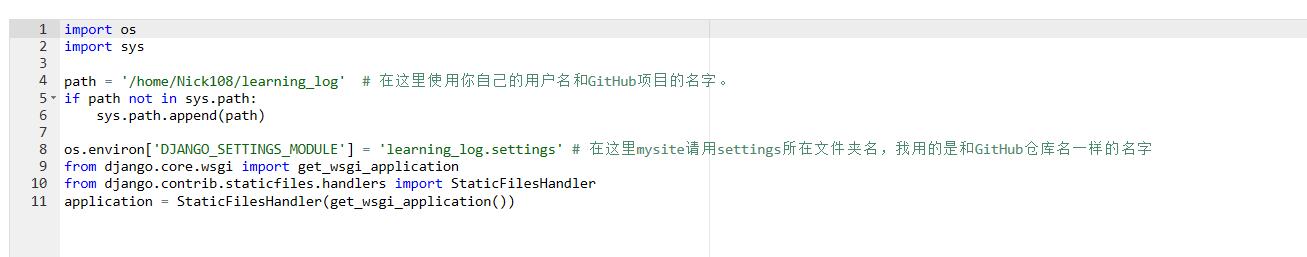 os.environ['DJANGO_SETTINGS_MODULE'] = 'mysite.settings' # 在这里mysite请用settings所在文件夹名,我用的是和GitHub仓库名一样的名字