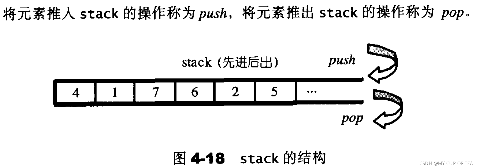 - Stack基于deque,这种“修改某物的接口 形成另外一种事物的”的性质归结为 adapter (配接器),因此将stack不归类为容器,而将其归结为 container adapter (容器适配器)
