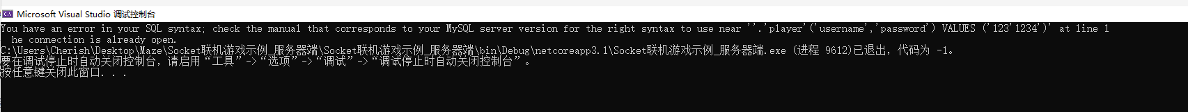 跟着学习视频通过做multiplayer来学习socket联网完成游戏,需要将c#的table组件获取的数据注册到mysql中记录出现了一些问题。