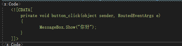 x:Code它的作用就是可以包含一些本应放置在代码中的C#代码。这样做的好处是不用把XAML代码和C#代码分置在两个文件中,但这样做个人觉得违背WPF的初衷,把UI代码和逻辑代码写在一起就体现不出来UI和逻辑代码完全分离。所以一般不用,除非遇到某种极端环境。