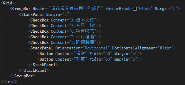 指定一个控件在某行,就为这个控件的标签添加Grid.Row=“行编号”这样一个特征,若编号为0(即控件处于首行)可以省略不写