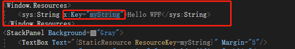 在WPF中几乎每个元素都有自己的Resources属性,这个属性是“Key-Value”式的集合,只要把元素放进这个集合,这个元素就成为资源字典中的一个条目,为了检索到这个条目,就必须为它加上x:Key。