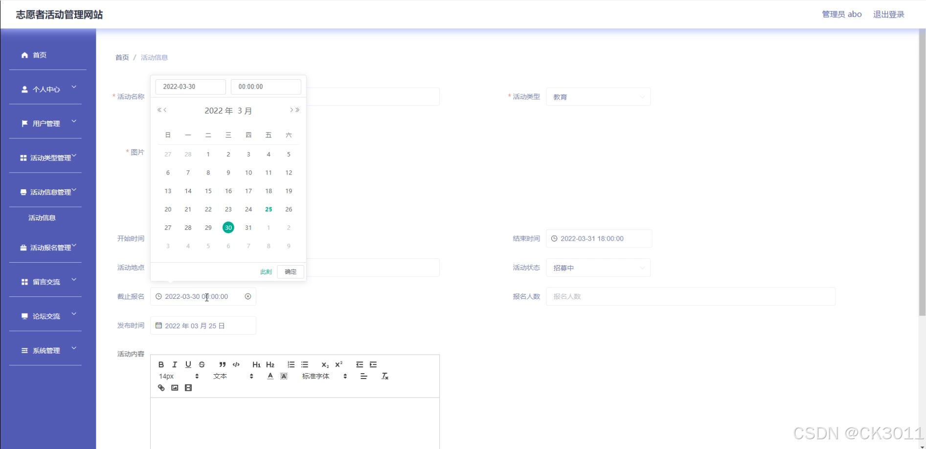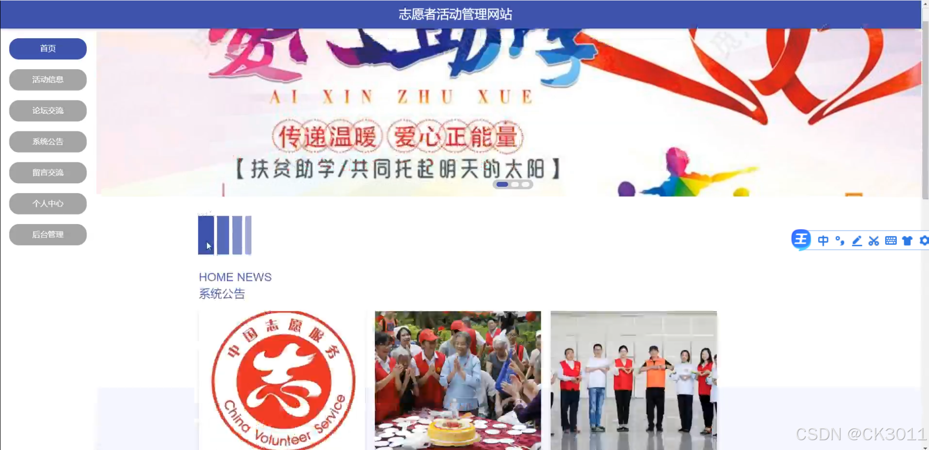 随着社会公益事业的蓬勃发展,志愿者活动已成为连接社会爱心与需求的重要桥梁。然而,传统志愿者活动管理方式存在报名流程繁琐、活动信息发布不及时、志愿者管理混乱等问题,限制了志愿者活动的效率与影响力。因此,开发一个志愿者活动管理网站,旨在优化志愿者活动管理流程,提升活动组织的透明度与效率,具有重要的现实意义。