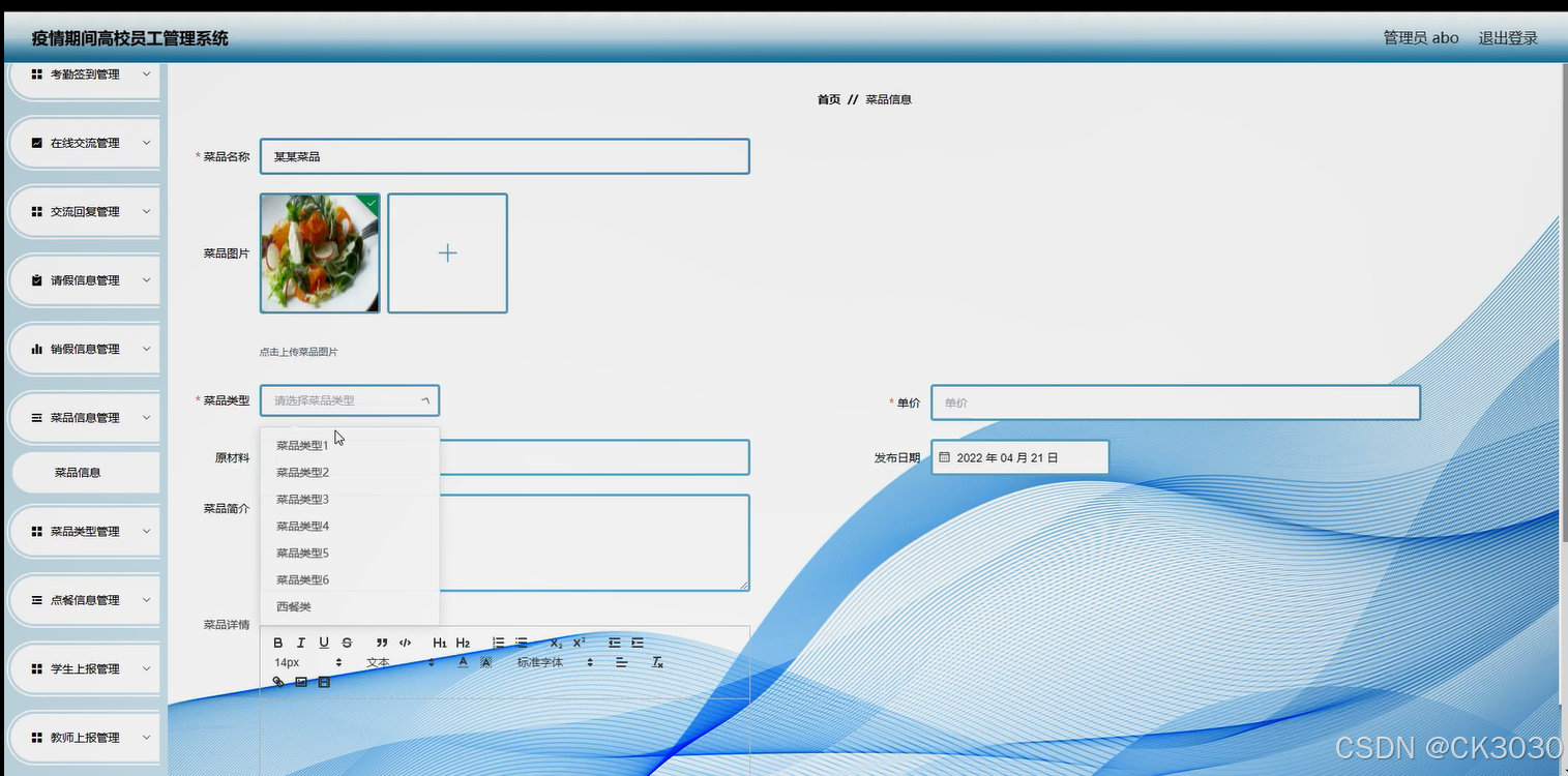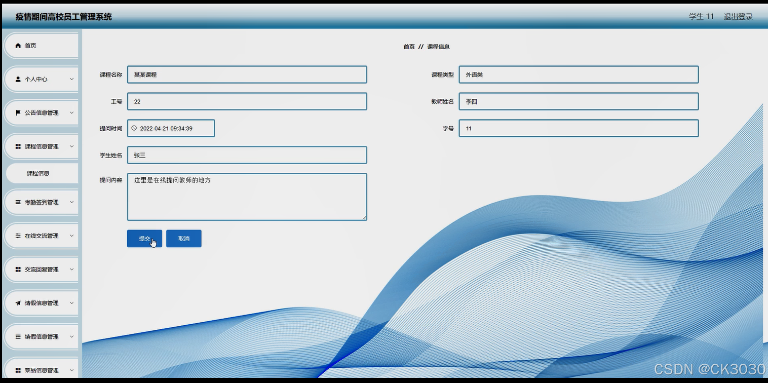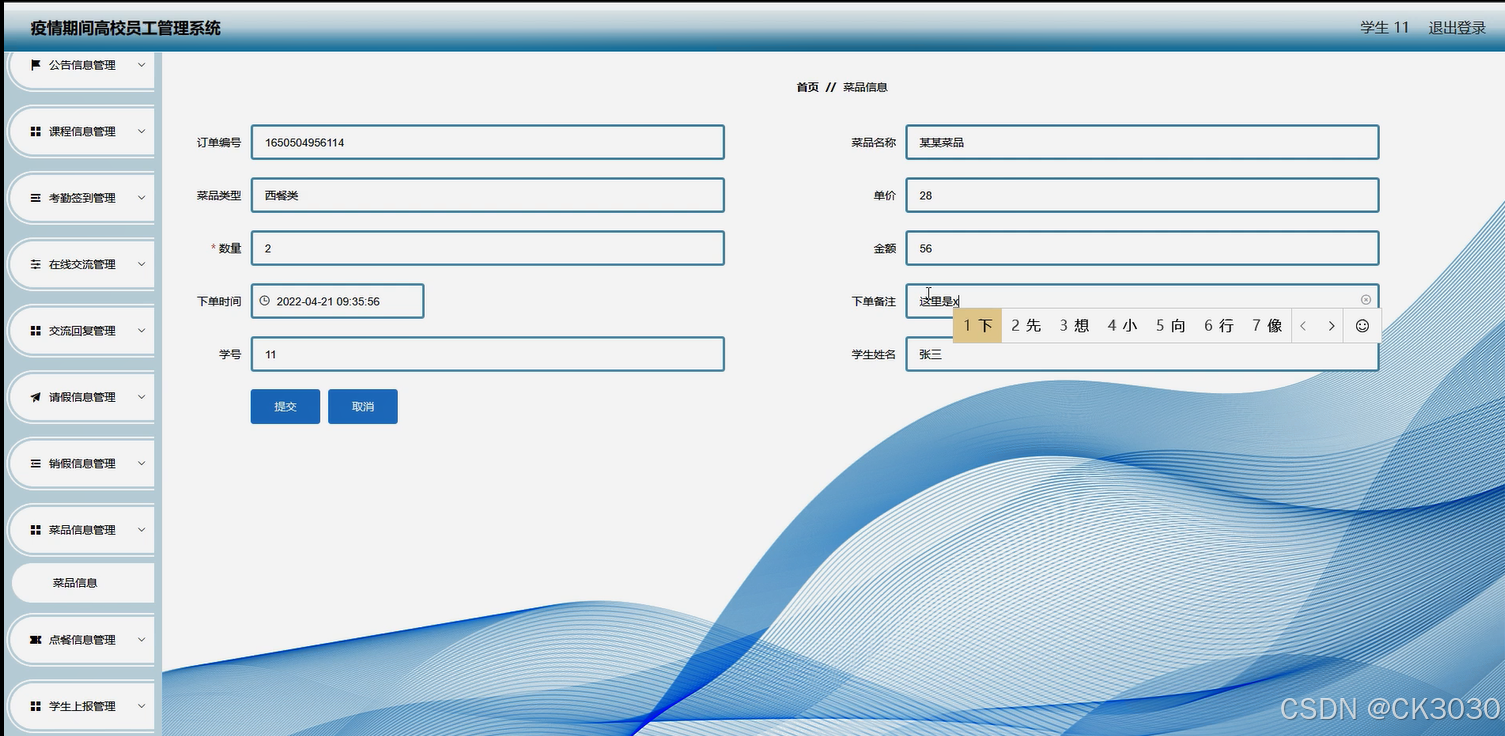 系统内容:学生,教师,辅导员,公告信息,课程信息,课程类型,考勤签到,在线交流,交流回复,请假信息,销假信息,菜品信息,菜品类型,点餐信息,学生上报,教师上报,辅导员上报