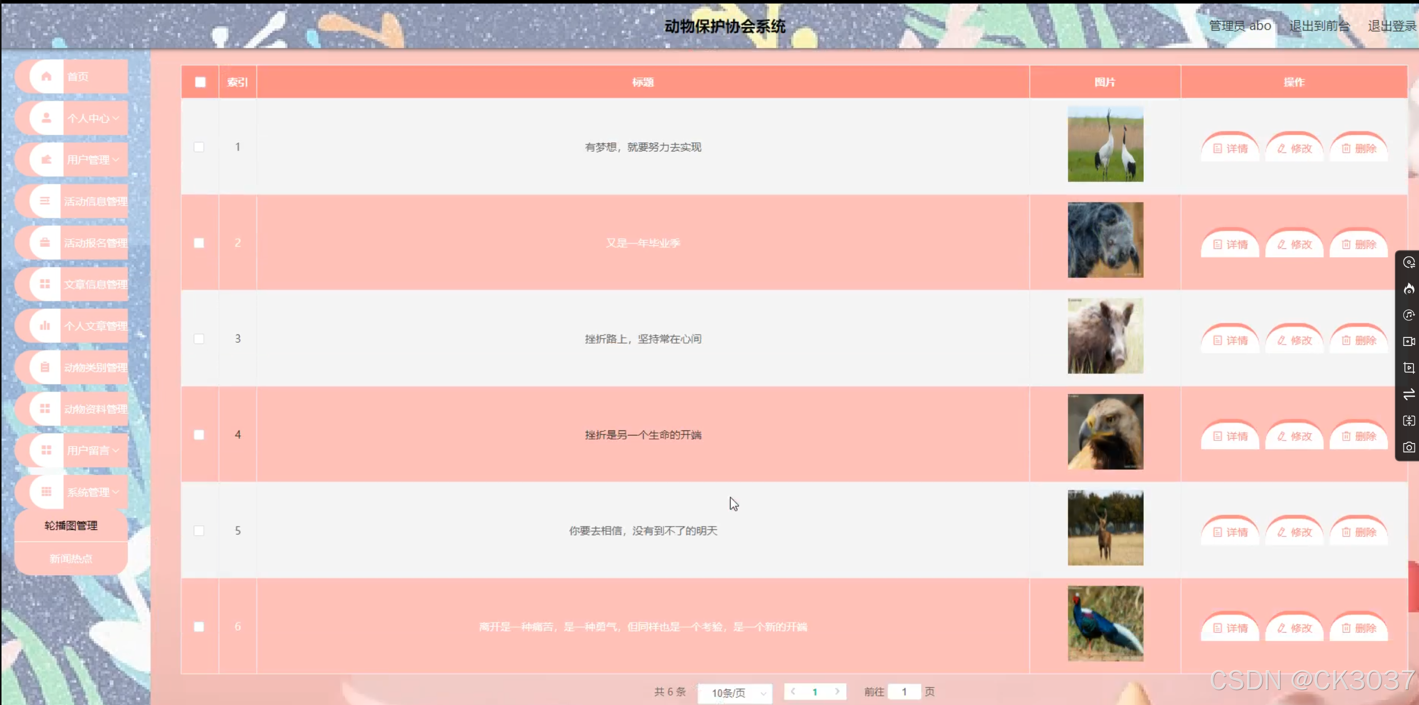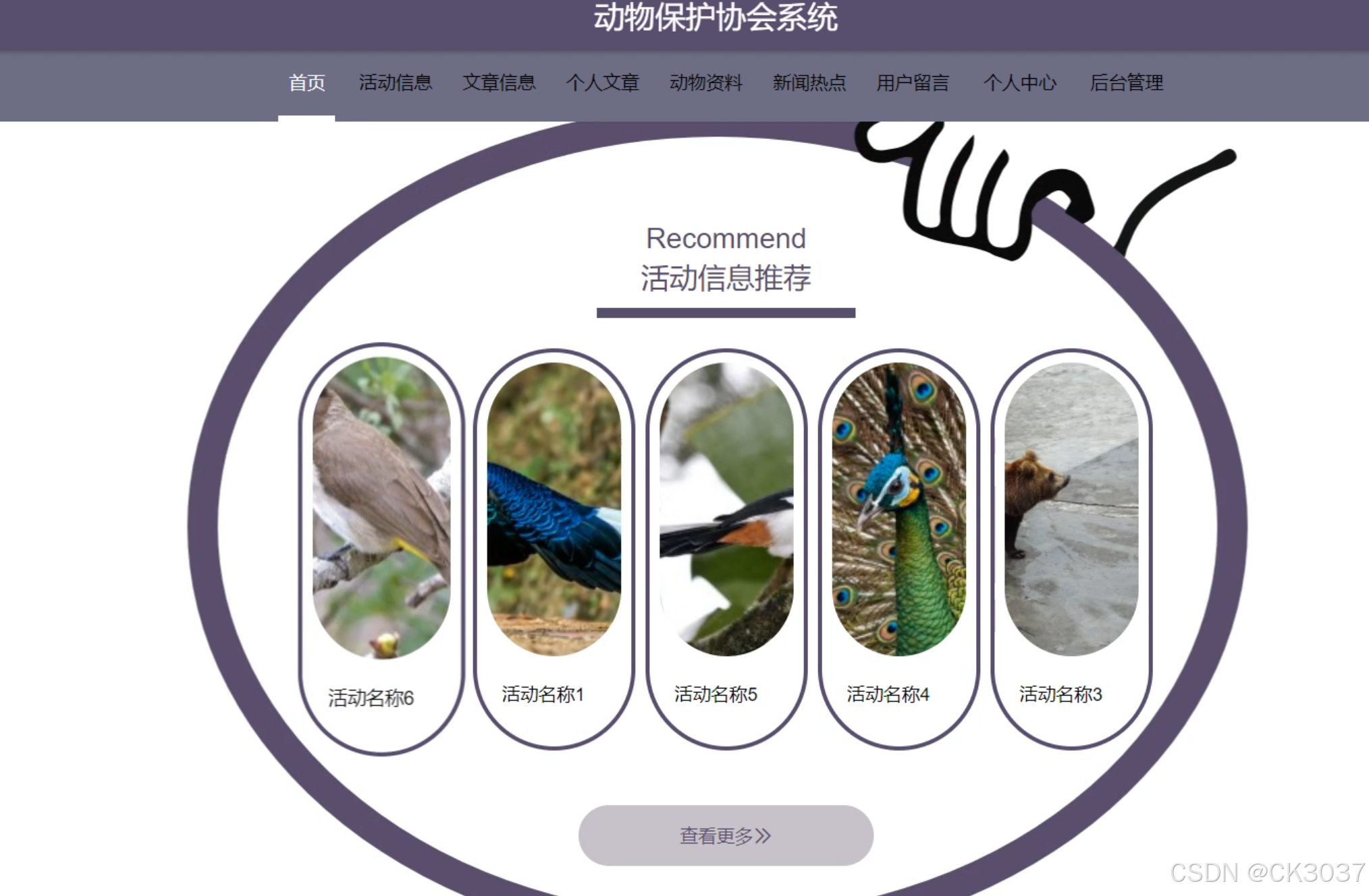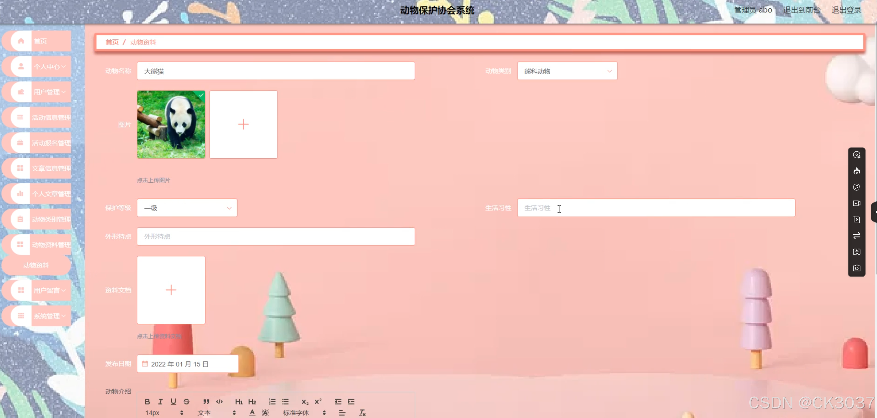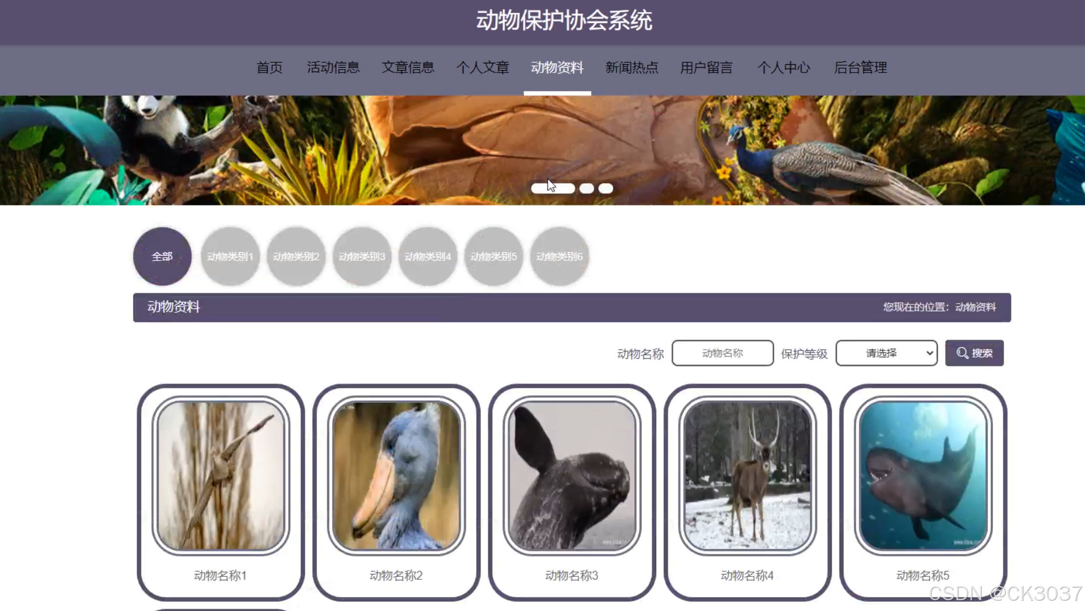 本项目旨在设计并实现一个功能完善的动物保护协会系统,以数字化手段加强动物保护知识的普及、提升公众参与度及优化动物救助流程。通过该系统的建立,实现用户管理、宣传资料发布、活动信息发布和报名、动物信息管理、领养信息发布等功能,简化协会管理流程,提高活动组织的效率和准确性。