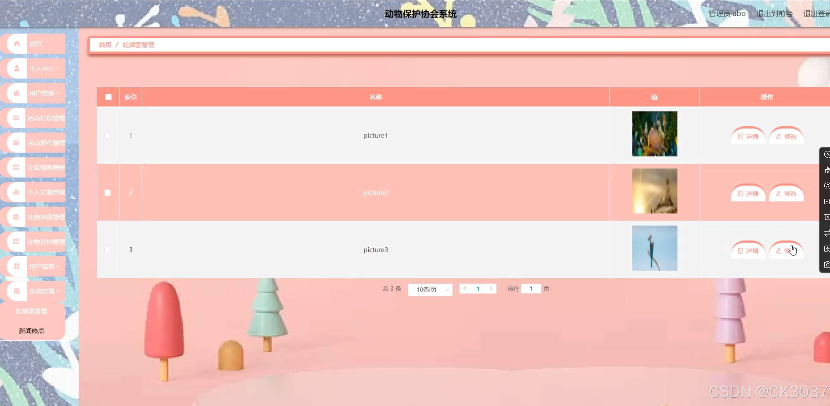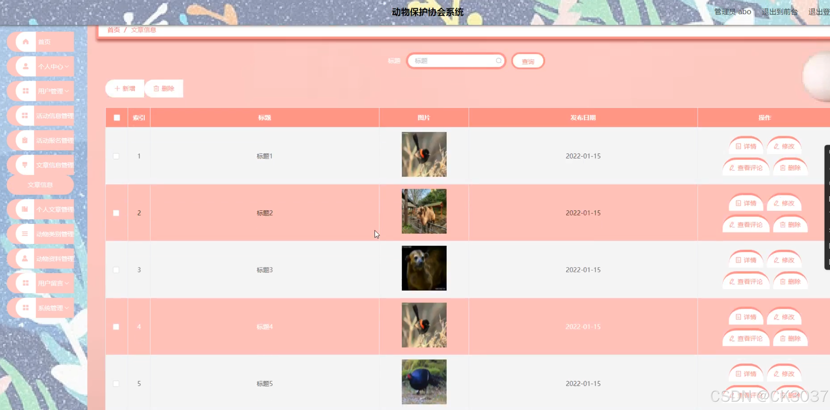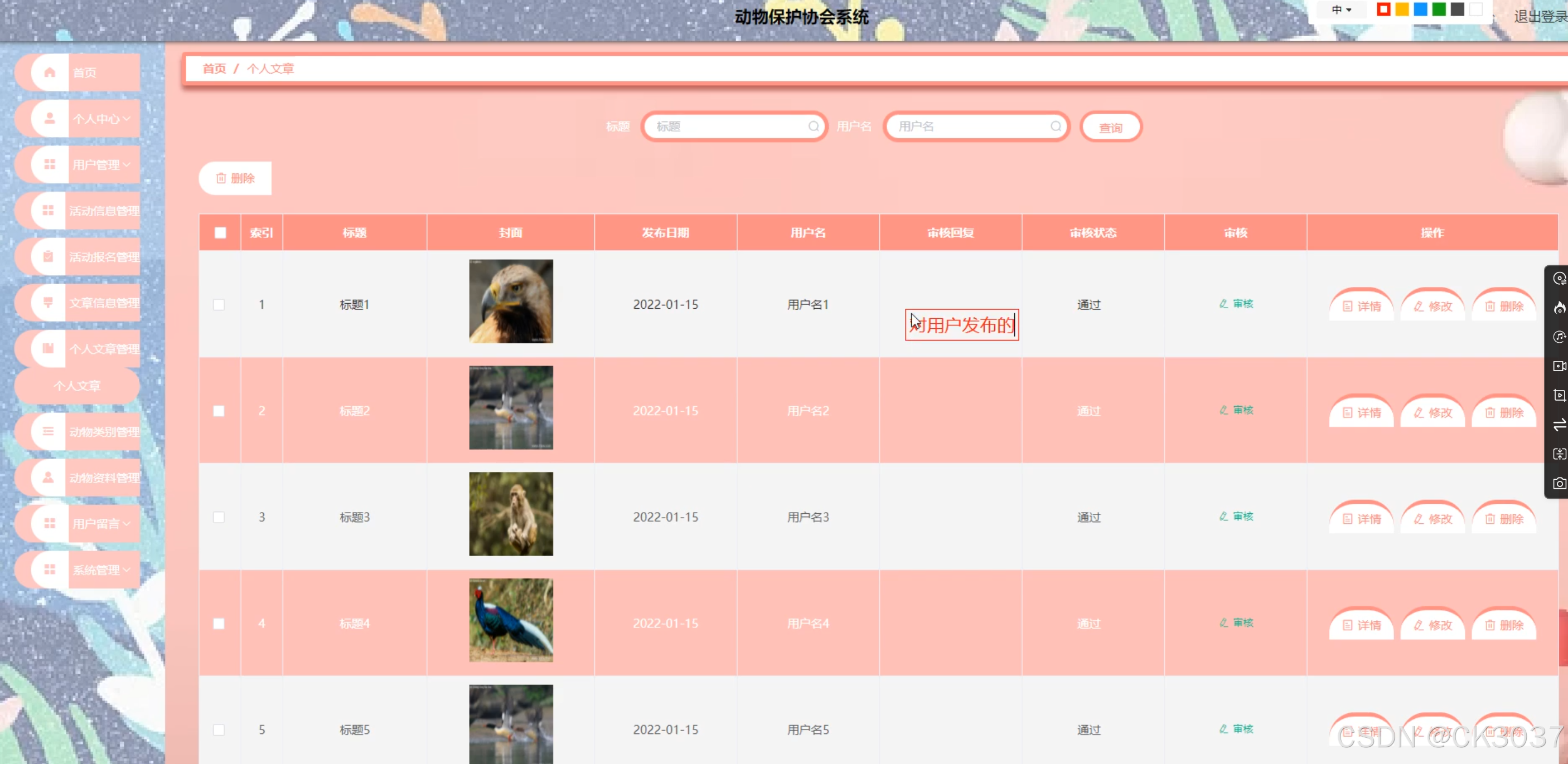 - 动物信息管理模块:记录需要保护的动物的基本信息、救助情况等,并提供动物救助、领养等操作。
