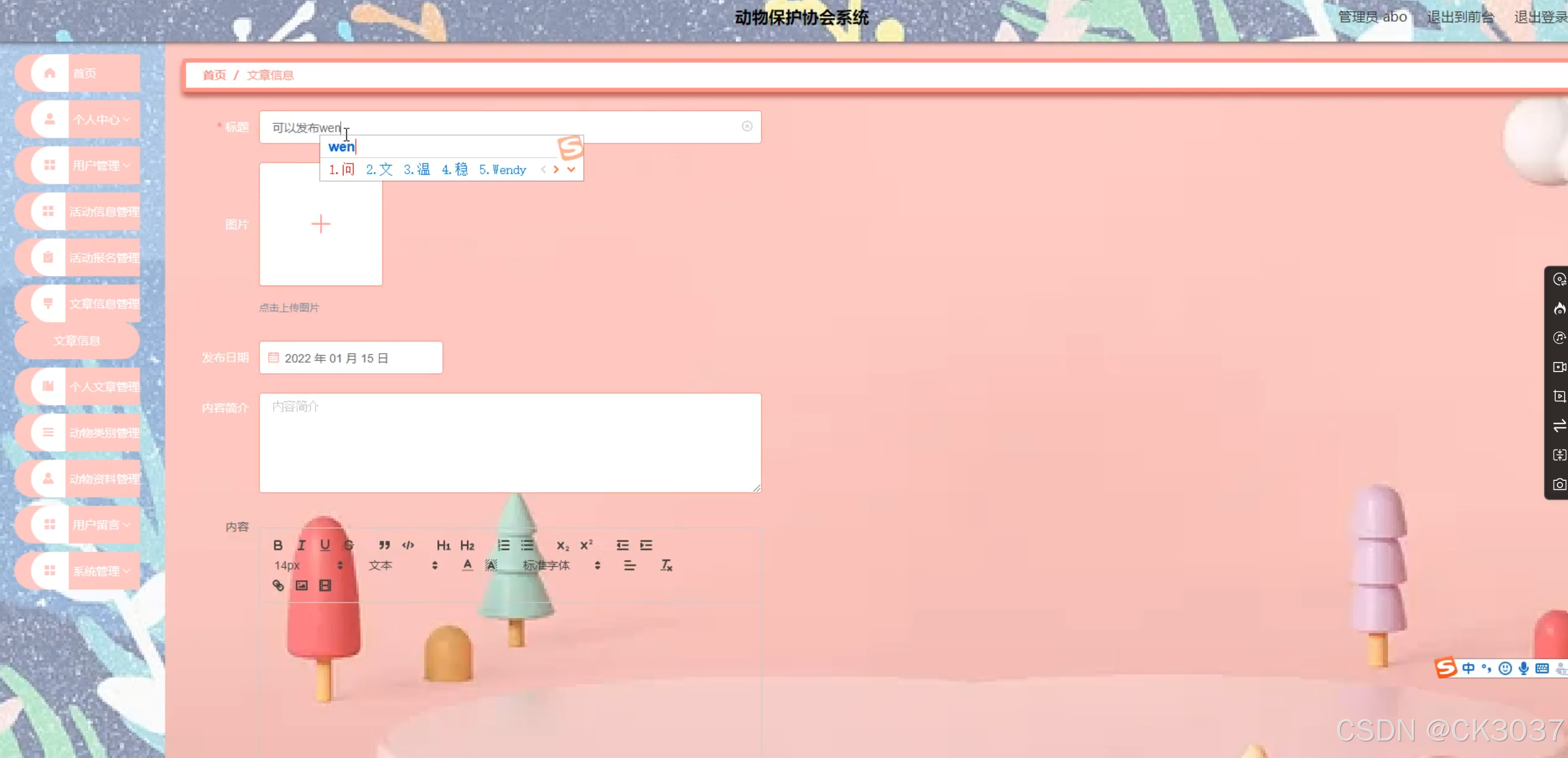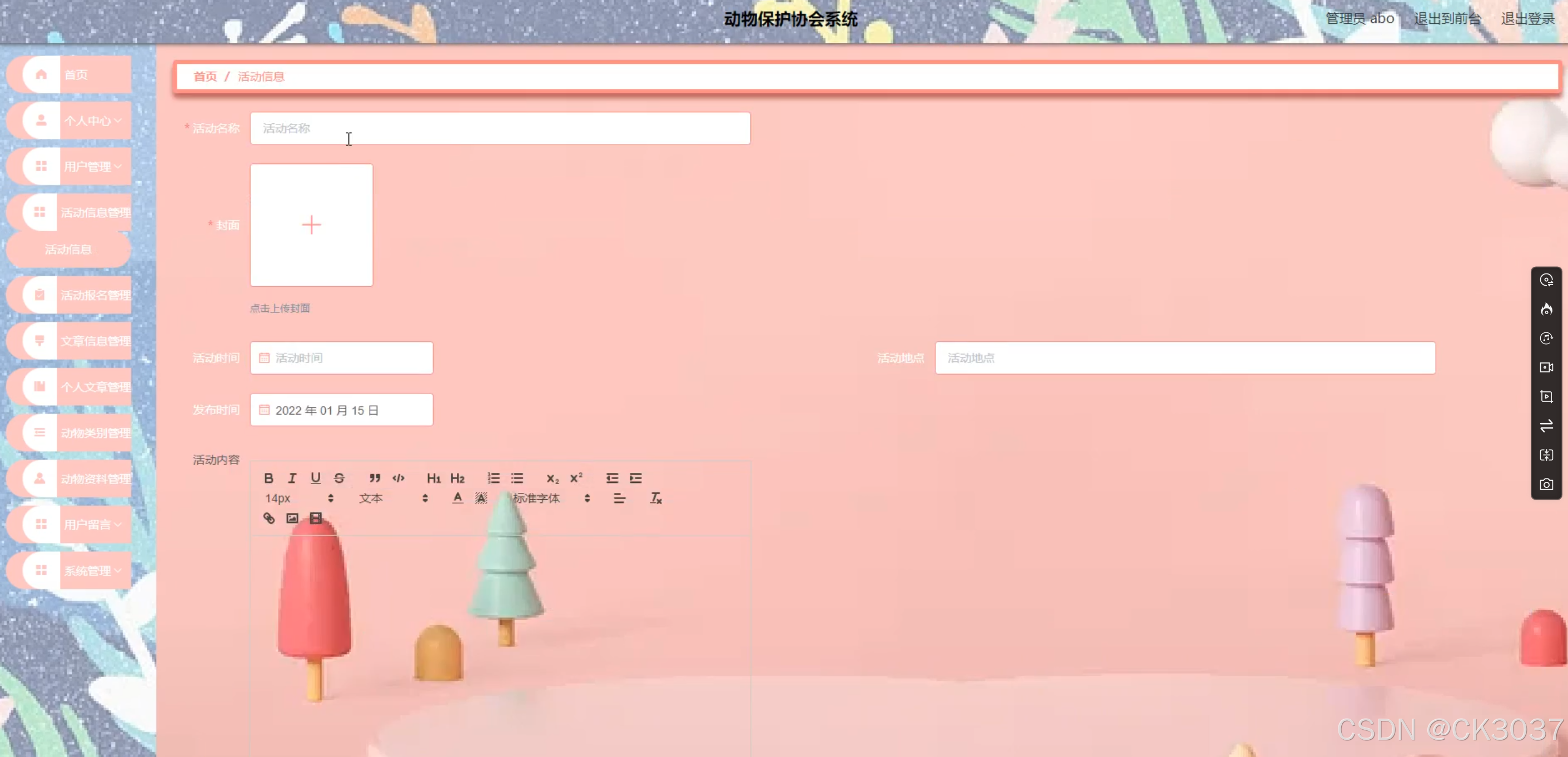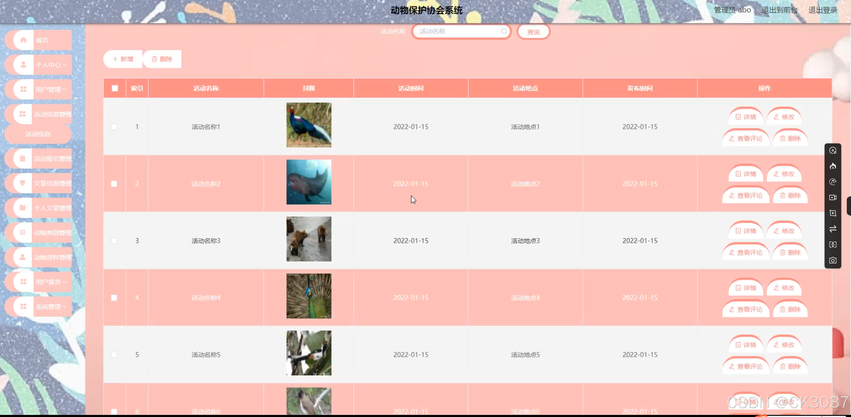 - 活动信息发布和报名模块:协会可以发布动物保护活动的信息,包括时间、地点、内容等,并提供在线报名和活动管理功能。
