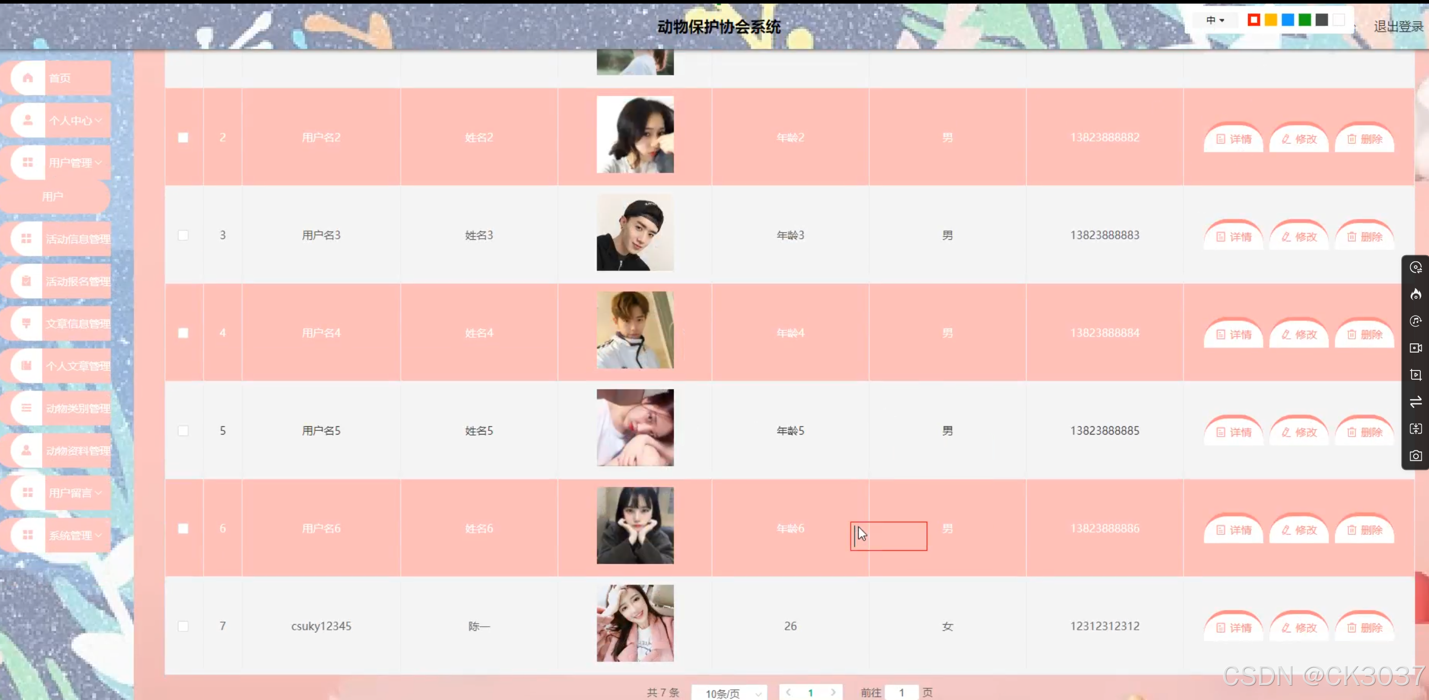 - 领养信息发布模块:协会可以发布需要领养的动物的信息,包括种类、性别、年龄等,并提供领养申请和审核功能。