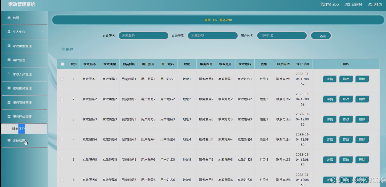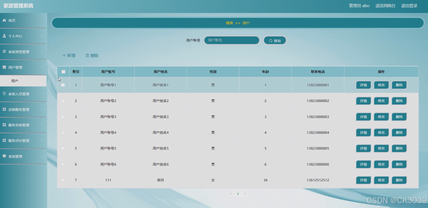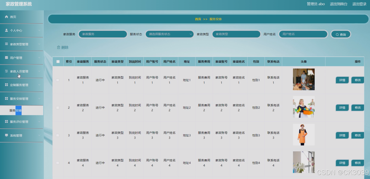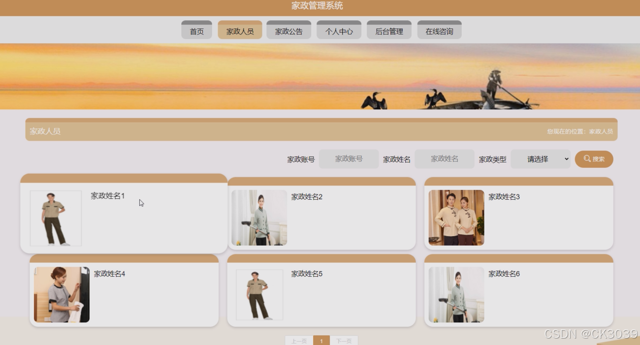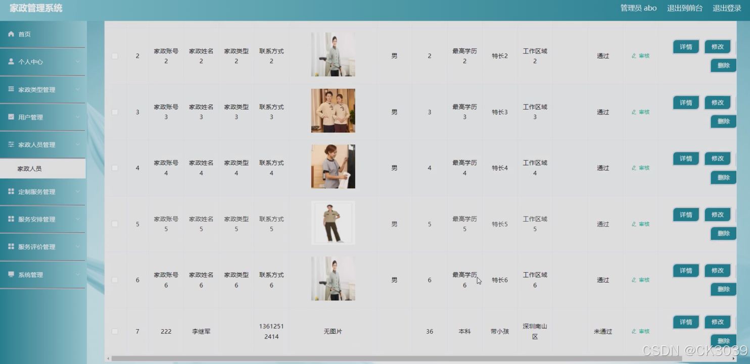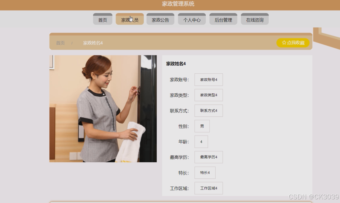 - 服务人员信息管理:记录家政服务人员的个人信息、专业技能、工作经验等,为用户提供详细的参考依据。