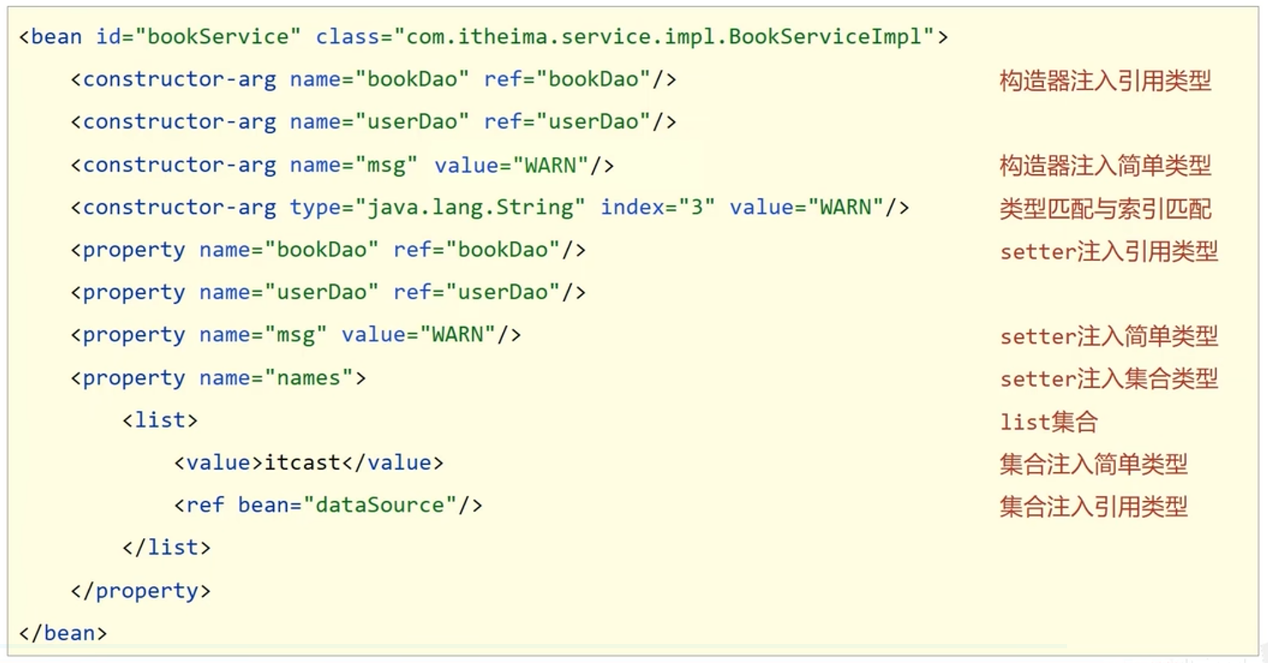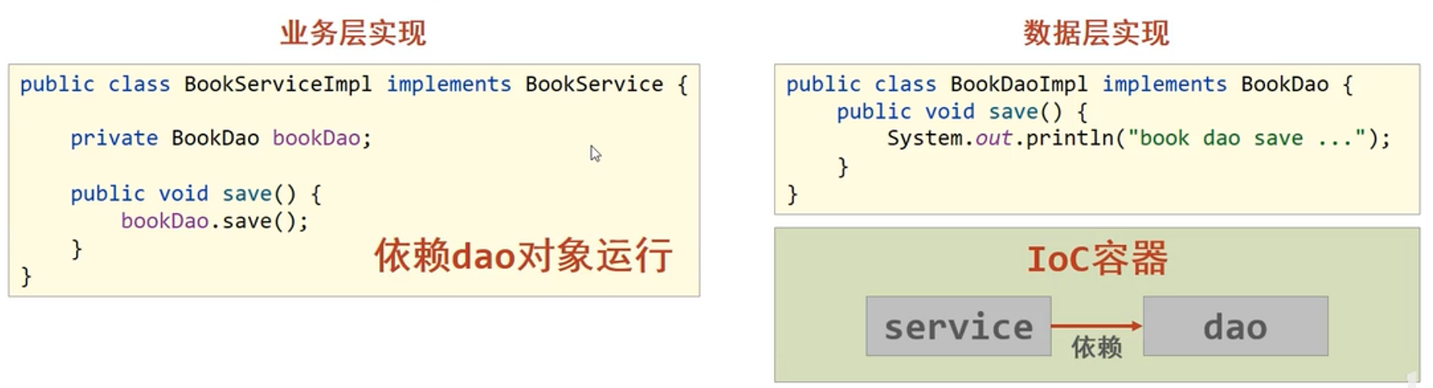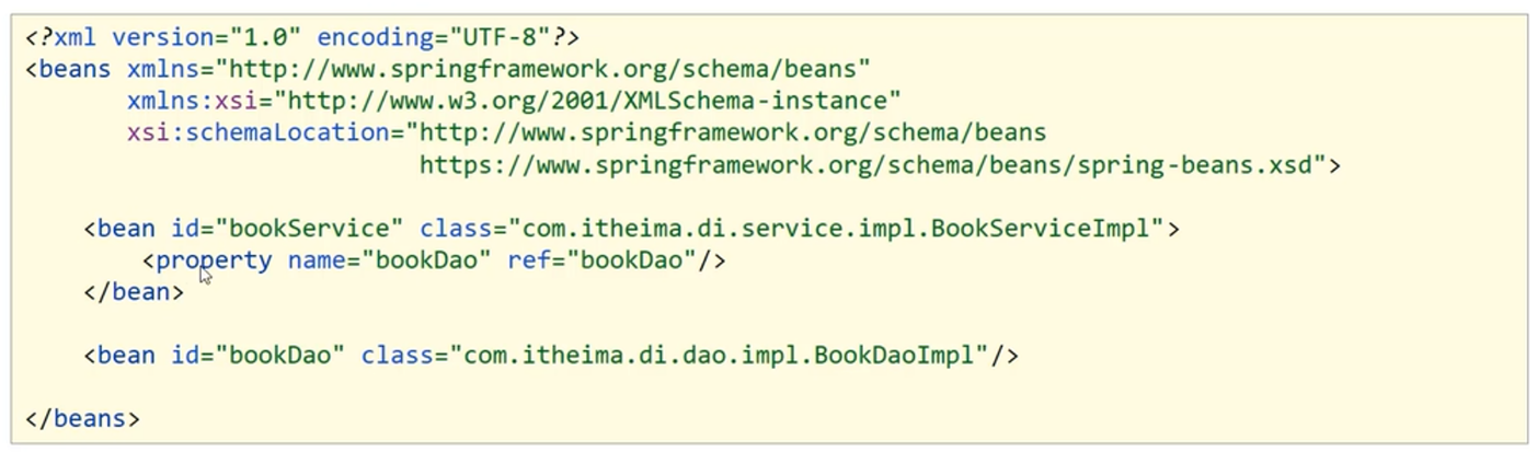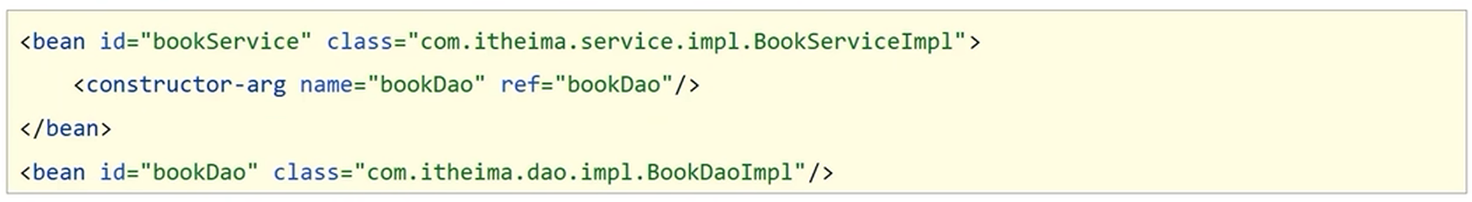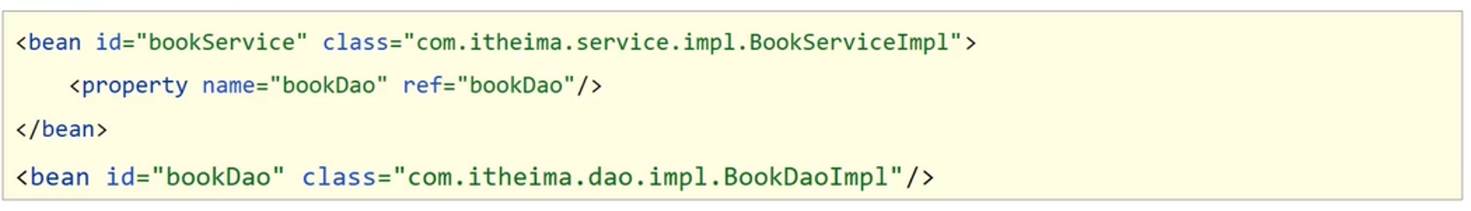 - 在IoC容器内将有依赖关系的bean进行关系绑定, 称为依赖注入