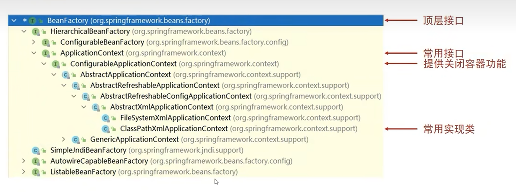 - BeanFactory是IoC容器的顶层接口,初始化BeanFactory对象时,加载的bean延迟加载