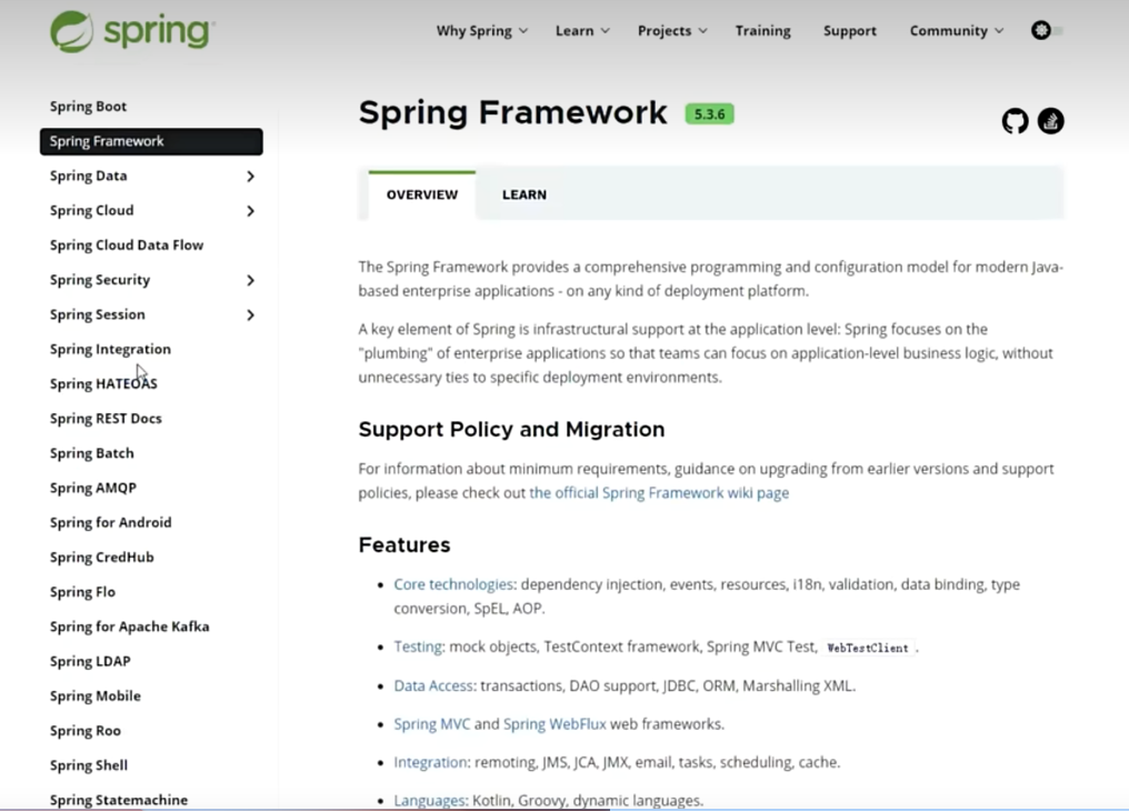 - Spring Framework: spring所有的技术都依赖Spring Framework