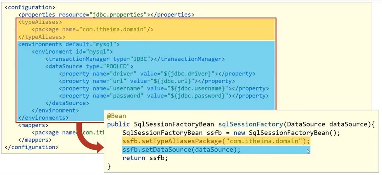 - 把mybatis的配置封装成配置对象, 并注册为bean