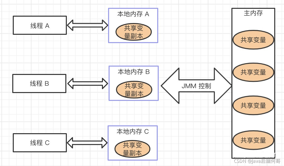 JMM 定义了线程和主内存之间的抽象关系:线程之间的共享变量存储在主内存中,每个线程都有一个私有的本地内存,本地内存中存储了该线程以读/写共享变量的副本。本地内存是JMM的一个抽象概念,并不真实存在。它涵盖了缓存、写缓冲区、寄存器以及其他的硬件和编译器优化。