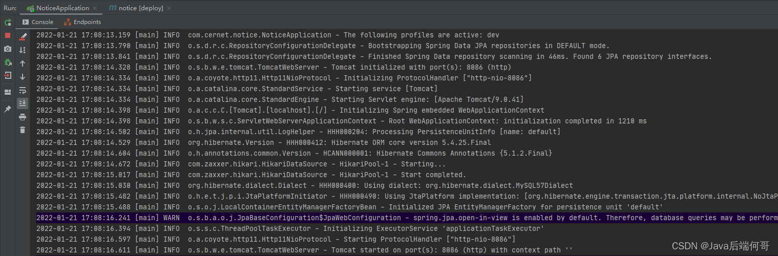 我们可以在application.properties中修改日志级别logging.level.root=WARN,这样核心Logger(包含嵌入式容器、hibernate、spring)会输出更多内容,还有自己应用的日志就会输出为DEBUG级别。