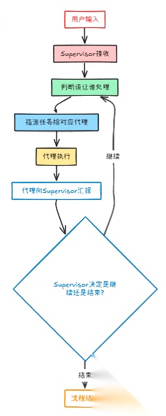 用户输入 → Supervisor接收 → 判断该让谁处理 → 指派任务给对应代理 → 代理执行完后向Supervisor汇报 → Supervisor决定是继续还是结束。