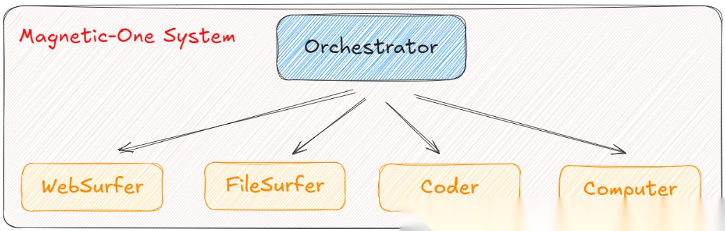 微软在 2024 年推出的 Magentic-One,可以说是当前多智能体系统的“教科书级”范例。它允许多个 AI 代理协同工作,每个代理都是某一领域的专家,彼此之间通过中心控制器(Orchestrator)进行通信与协调。