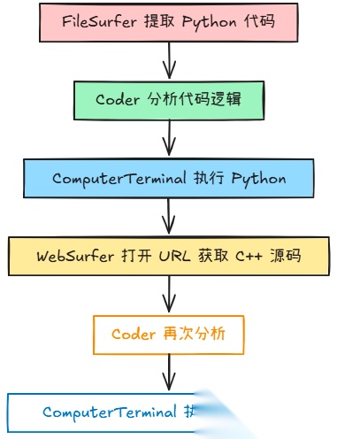 FileSurfer提取 Python 代码;Coder分析代码逻辑;ComputerTerminal执行 Python;WebSurfer打开 URL 获取 C++ 源码;Coder再次分析;- 最终由