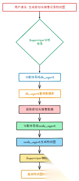 数据库管理员(db_agent)负责对接数据库,提取数据。数据分析师(code_agent)拿到数据后用Python进行分析,生成可视化图表。Supervisor在其中扮演协调者的角色,判断用户需求,然后分别指派任务。