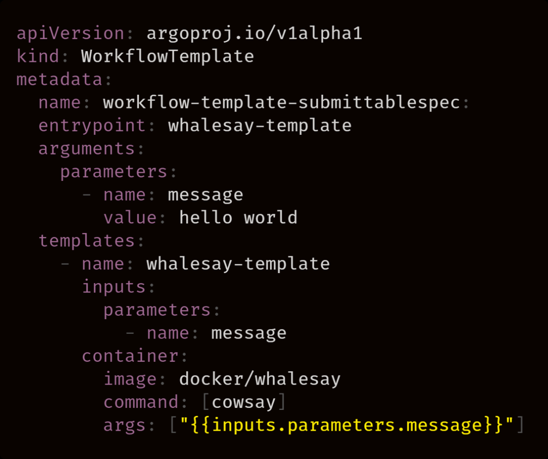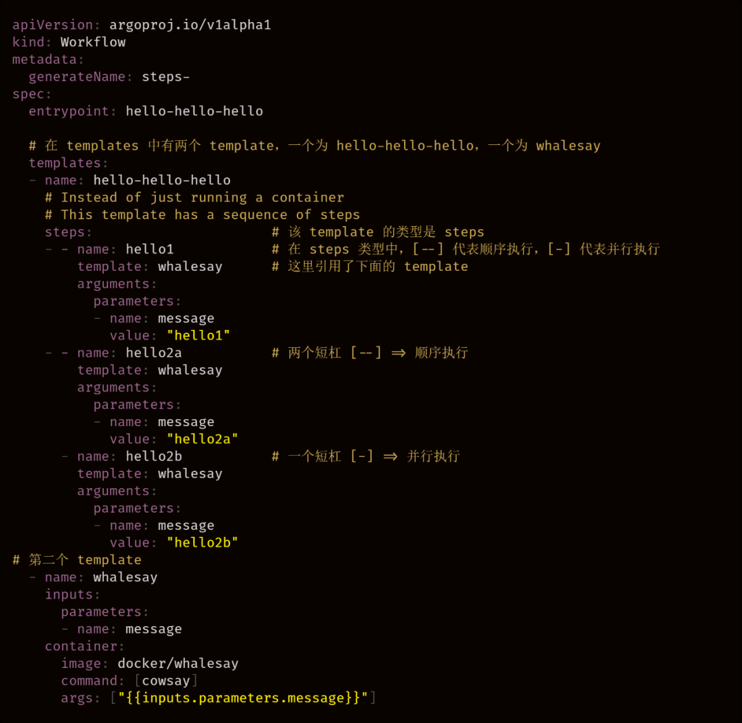 在这个例子中,该 Workflow 的 templates 字段中指定了一个类型为 container 的 template,使用了 whalesay 镜像。