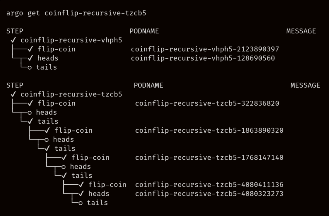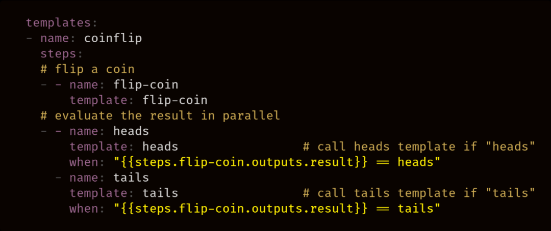 Template 可以递归地相互调用,这是一个非常实用的功能。例如在机器学习场景中:可以设定准确率必须满足一个值,否则就持续进行训练。在下面这个抛硬币例子中,我们可以持续抛硬币,直到出现正面才结束整个工作流。