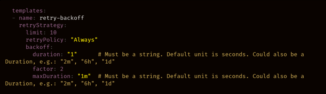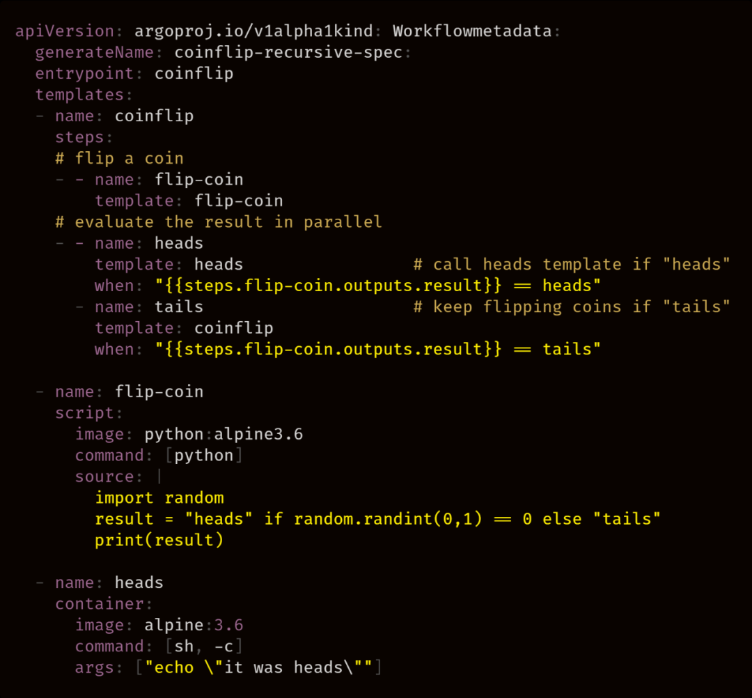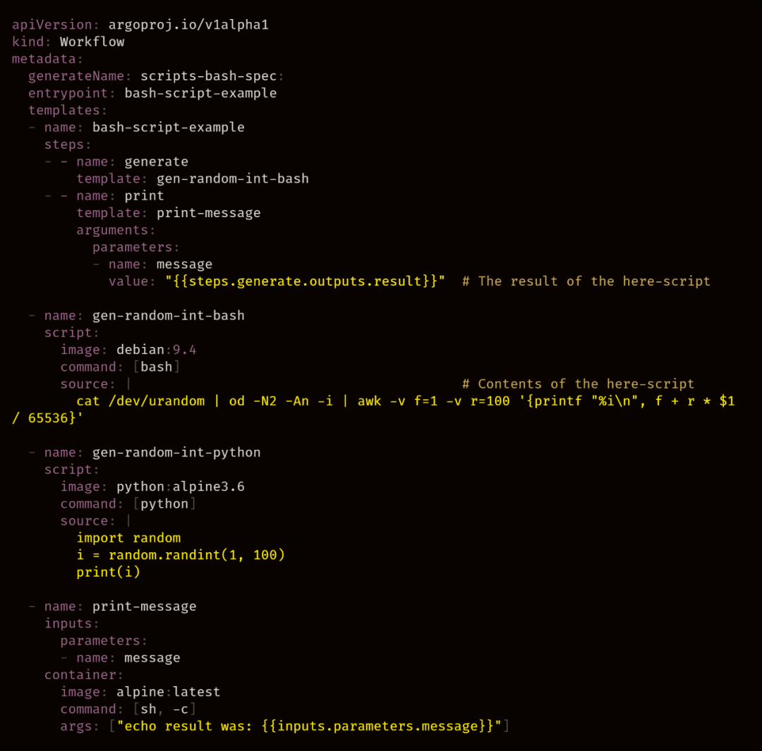 在上面的例子中,有两个类型为 script 的 template,script 允许使用 source 规范脚本主体。这将创建一个包含脚本主体的临时文件,然后将临时文件的名称作为最后一个参数传递给 command(执行脚本主体的解释器),这样便可以方便的执行不同类型的脚本(bash、python、js etc)。