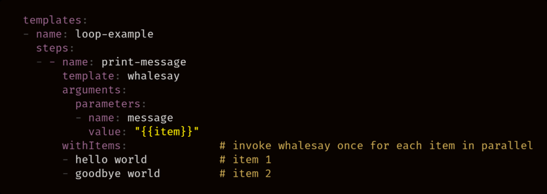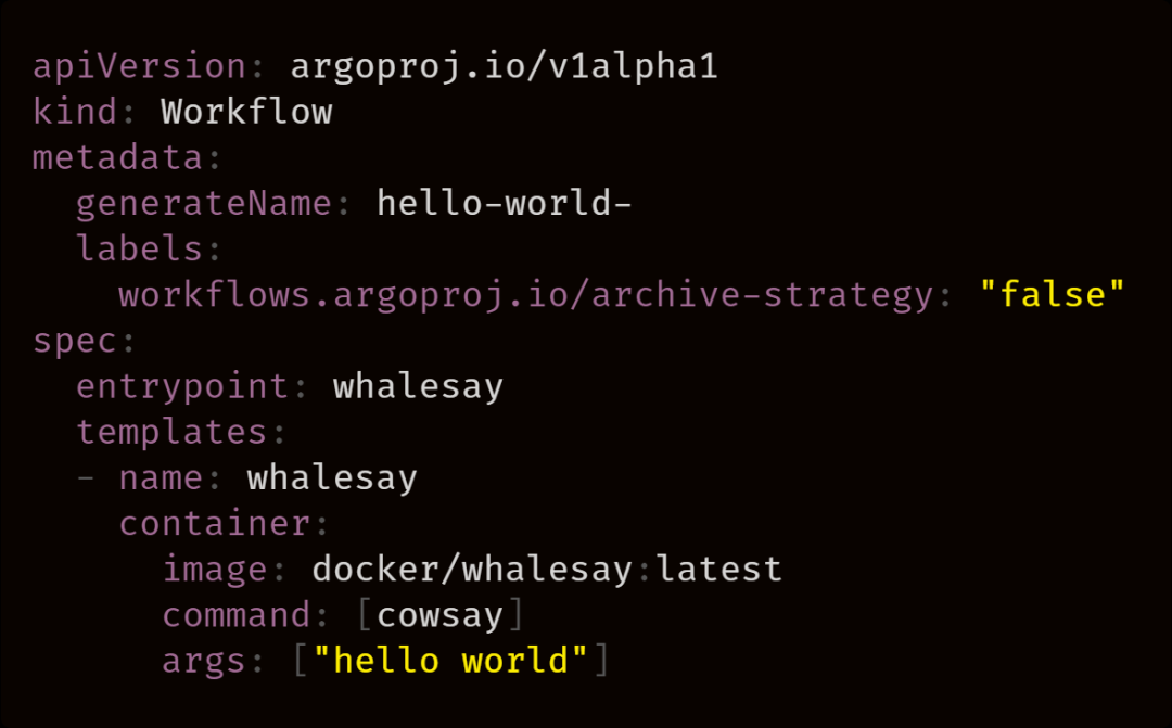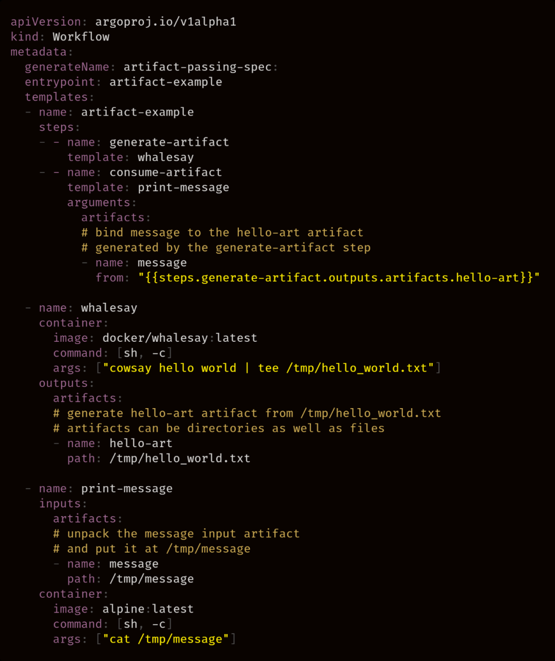 在上面的例子里,名为 whalesay 的 template 使用 cowsay 命令生成一个名为 /tmp/hello-world.txt 的文件,然后将该文件作为一个名为 hello-art 的 Artifact 输出。名为 print-message 的 template 接受一个名为 message 的输入 Artifact,在 /tmp/message 的路径上解包它,然后使用 cat 命令打印 /tmp/message 的内容。