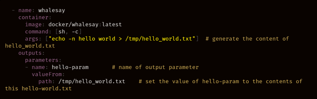 Parameter 提供了一种通用机制,可以将步骤的结果用作参数。Parameter 的工作原理与脚本结果类似,除了输出参数的值会被设置为生成文件的内容,而不是 stdout 的内容。如: