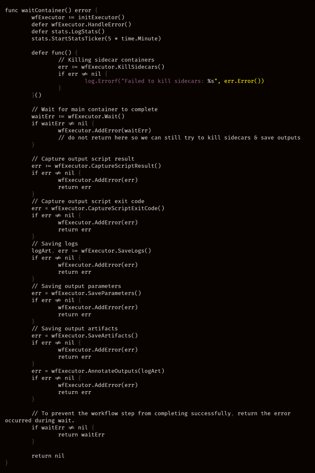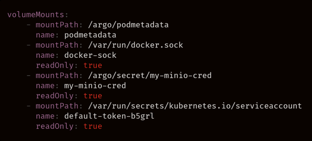 在 Argo 中,这些 Sidecar 的镜像都是 argoexec。Argo 通过这个 executor 来完成一些流程控制。
