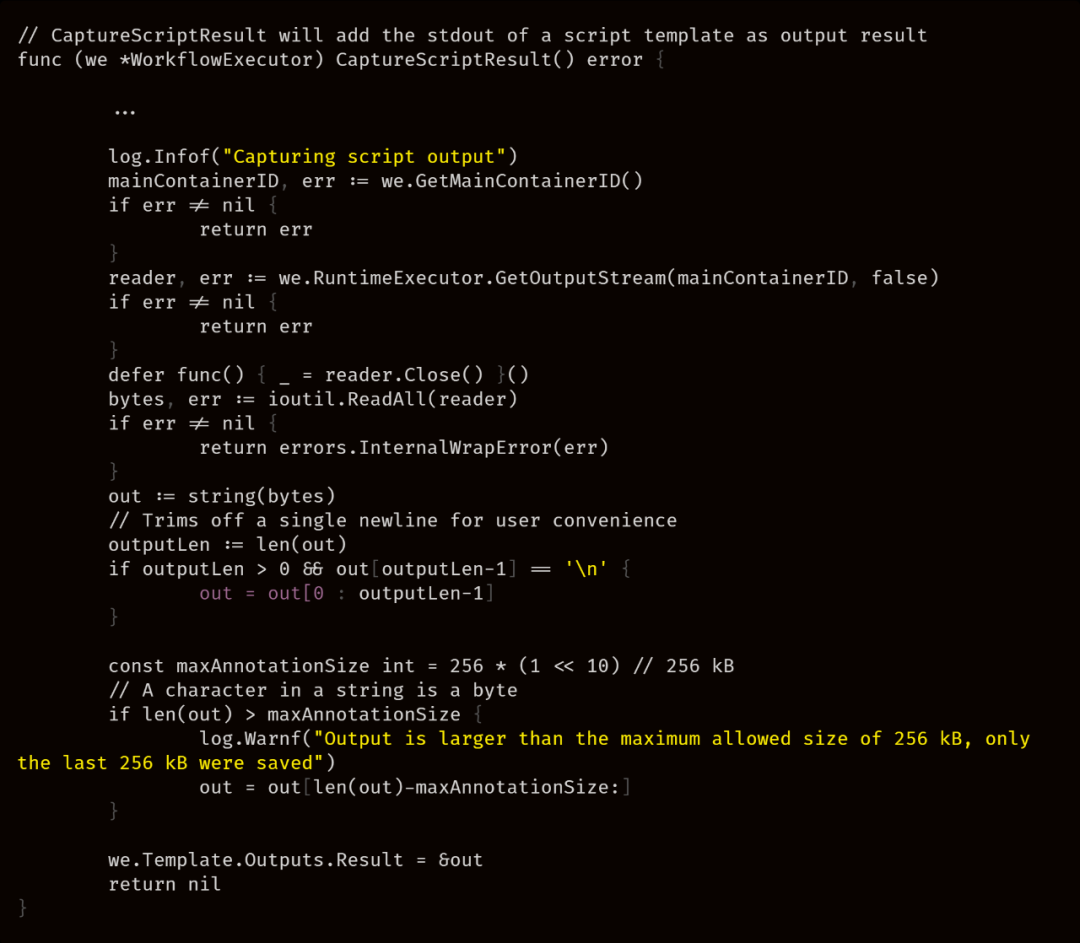 现在就十分明确了,Wait Container 通过挂载 docker.sock 以及 service account,获取到 Main Container 中的输出结果,并保存到 Workflow 中。当然,因为 Workflow 中保存了大量的信息,当一个 Workflow 的 Step 过多时,整个 Workflow 的结构会过于庞大。