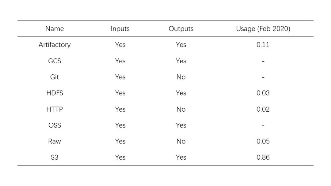 要使用 Argo 的 Artifact,首先必须配置和使用 Artifact 存储仓库。具体的配置方式可以通过修改存有 Artifact Repository 信息的默认 Config Map 或者在 Workflow 中显示指定,详见 配置文档,在此不做赘述。下表为 Argo 支持的仓库类型。