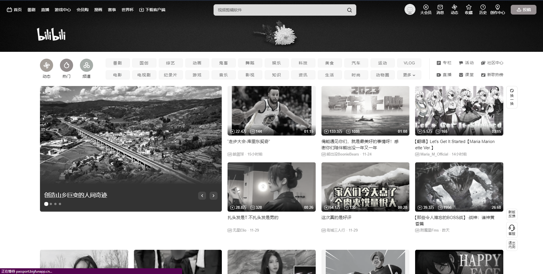 其中grayscale指的是元素灰度值,1表示100%为灰色,相当于给当前元素添加了一层滤镜。其实实现这个效果很简单,只需一行代码即可实现,今天打开B站发现B站的主题色都变成了黑白色。