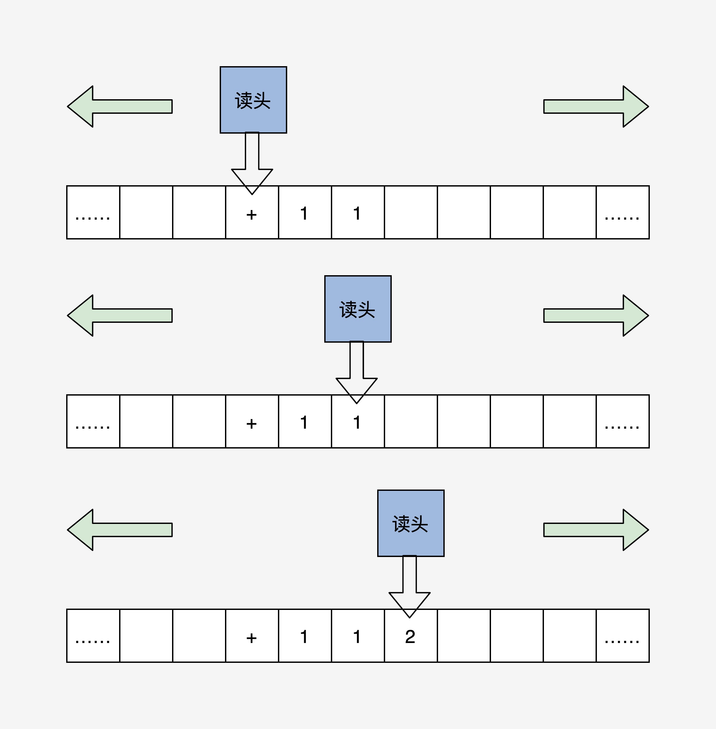 不理解?下面我再带你用图灵机执行一下“1+1=2”的计算,你就明白了。我们定义读头读到“+”之后,就依次移动读头两次并读取格子中的数据,最后读头计算把结果写入第二个数据的下一个格子里,整个过程如下图: