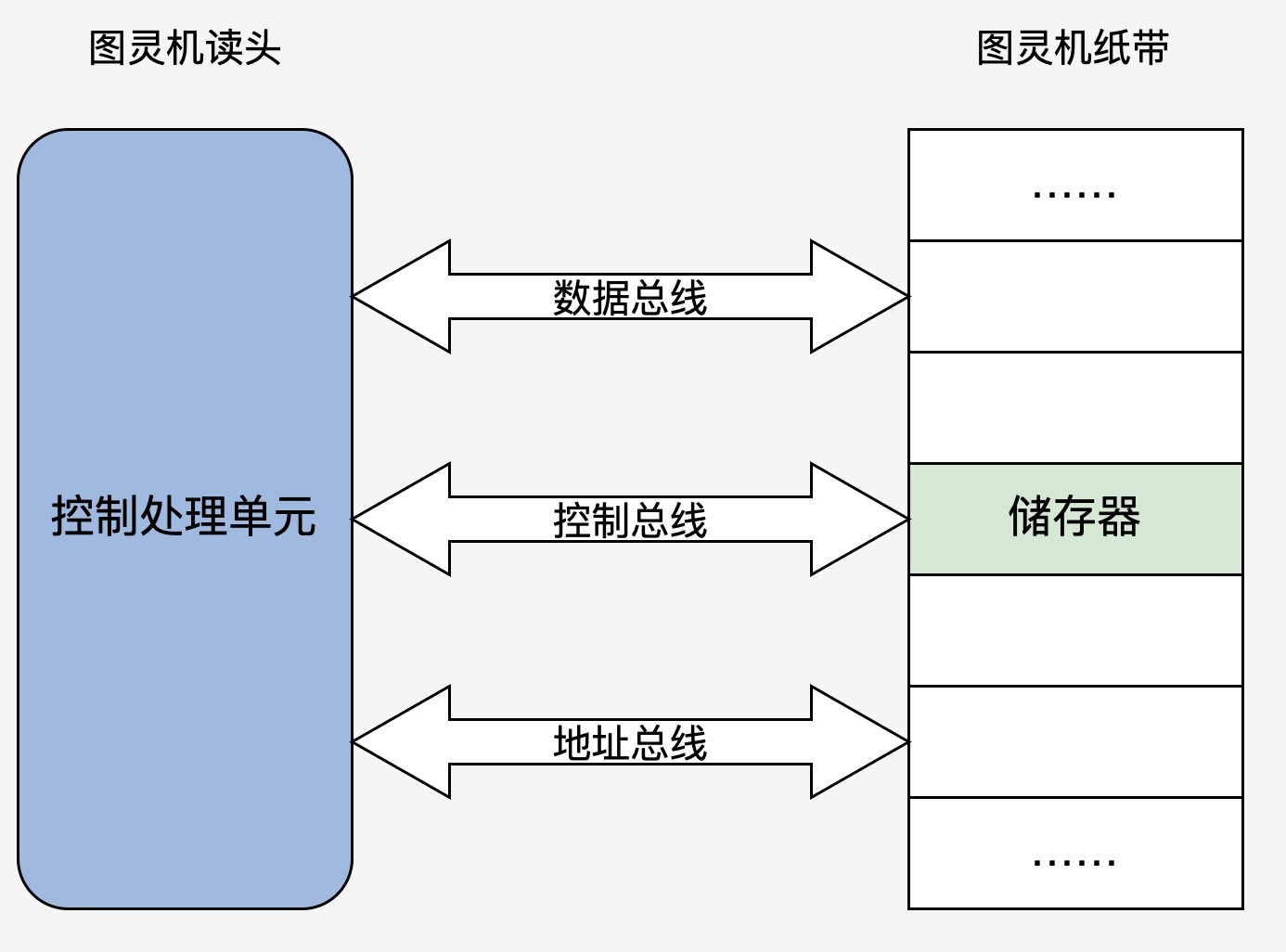 根据冯诺依曼的理论,我们只要把图灵机的几个部件换成电子设备,就可以变成一个最小核心的电子计算机,如下图: