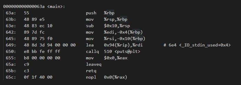 以上图中,分成四列:第一列为地址;第二列为十六进制,表示真正装入机器中的代码数据;第三列是对应的汇编代码;第四列是相关代码的注释。这是x86_64体系的代码,由此可以看出x86 CPU是变长指令集。