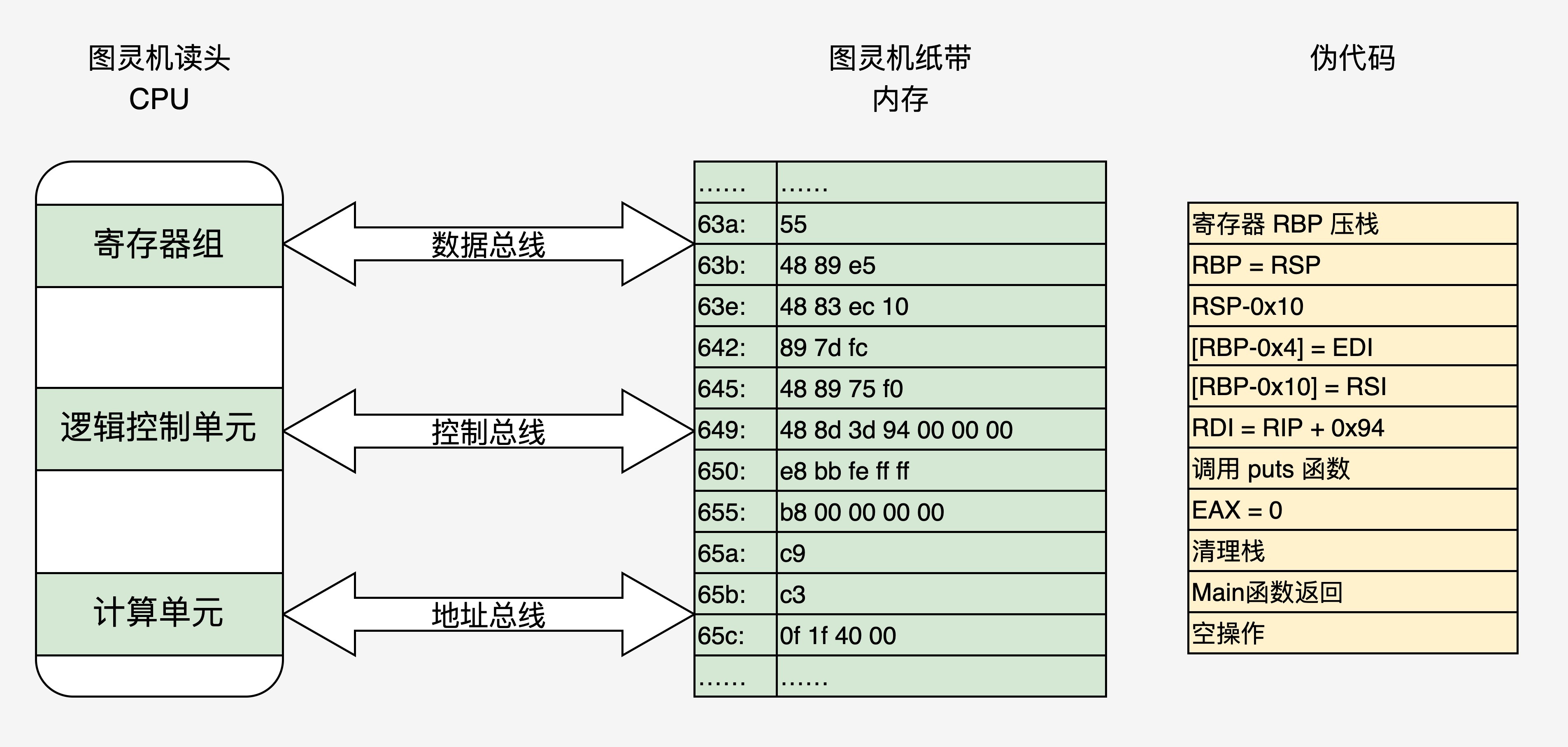 以上,对应图中的伪代码你应该明白了:现代电子计算机正是通过内存中的信息(指令和数据)做出相应的操作,并通过内存地址的变化,达到程序读取数据,控制程序流程(顺序、跳转对应该图灵机的读头来回移动)的功能。