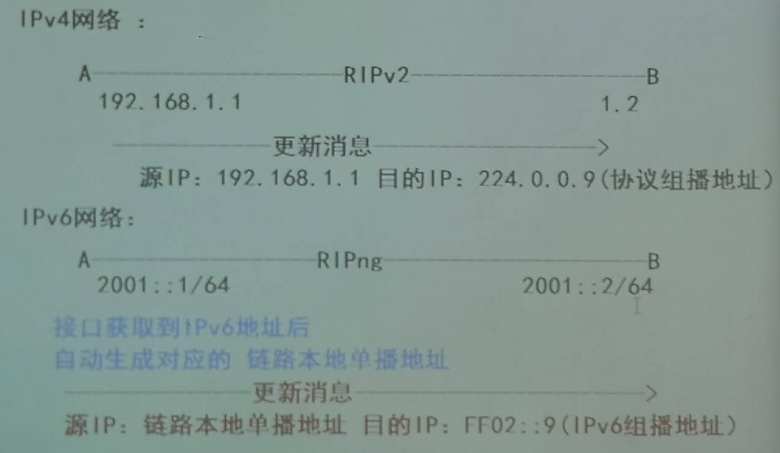 RIPng为针对IPv6报文进行了如下更改: