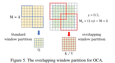Overlapping Cross-Attention Block (OCAB) 模块则通过引入重叠交叉注意力层,在窗口自注意力中建立了窗口之间的交叉连接,以增强网络的表征能力。该模块的设计可以更好地利用窗口内部的像素信息进行查询,从而提高重建任务的性能。