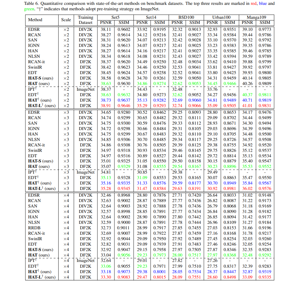 因此,为了激活更多的输入像素以实现更好的重建效果,本文构建了一种新颖的混合注意力 Transformer(HAT)方法。该方法结合了通道注意力和基于窗口的自注意力机制,充分利用它们在利用全局统计信息和强大的局部拟合能力方面的互补优势。此外,为了更好地聚合跨窗口信息,作者引入了一个重叠的交叉注意力模块,增强了相邻窗口特征之间的交互作用。在训练阶段,还采用了相同任务的预训练策略,以进一步挖掘模型的潜力以获得更好的性能。