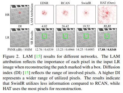LAM 能够显示出哪些输入像素对于重建贡献最大。通过 LAM 的分析,我们可以发现 SwinIR(基于Transformer的方法)在利用的信息范围上并不比基于 CNN 的方法(如RCAN)更广泛。这与常识相矛盾,但也给作者带来了额外的启示。