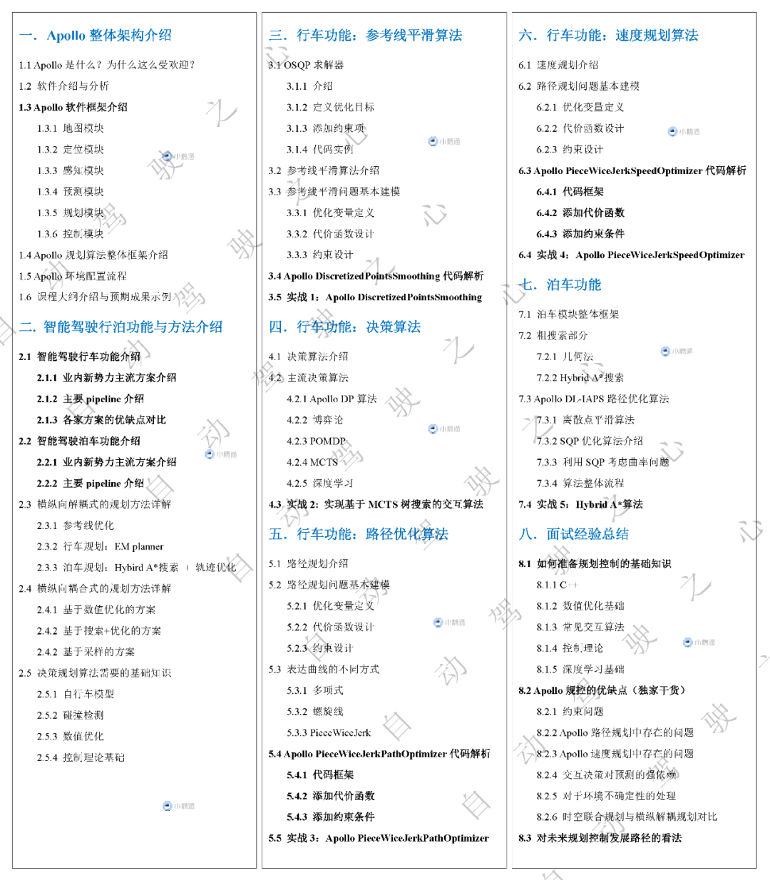 前面七个章节主要聚焦在技术层面,第八章则聚焦于求职面试。很多校招生或者转行而来的小伙伴不清楚如何准备面试,所以老师从面试官的角度先带大家复盘如何准备规控相关的基础知识,C++/数值优化/常见的交互算法/控制理论和深度学习等等。接着老师根据个人多年的工作经验,为大家带来独家干货—Apollo规控的优缺点分析,实打实的干货!