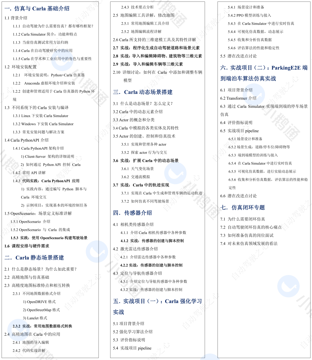 课程针对仿真领域常用的传感器部分、动态场景搭建、静态场景搭建、端到端模仿学习、强化学习等多个内容展开了详细剖析。知其然知其所以然,每个章节配备了多个实战内容,后期更有目前大火的端到端模型仿真与强化学习大项目。末尾也给大家准备了自动驾驶仿真领域的一些行业分享与求职相关内容,助力求职和职业生涯规划。