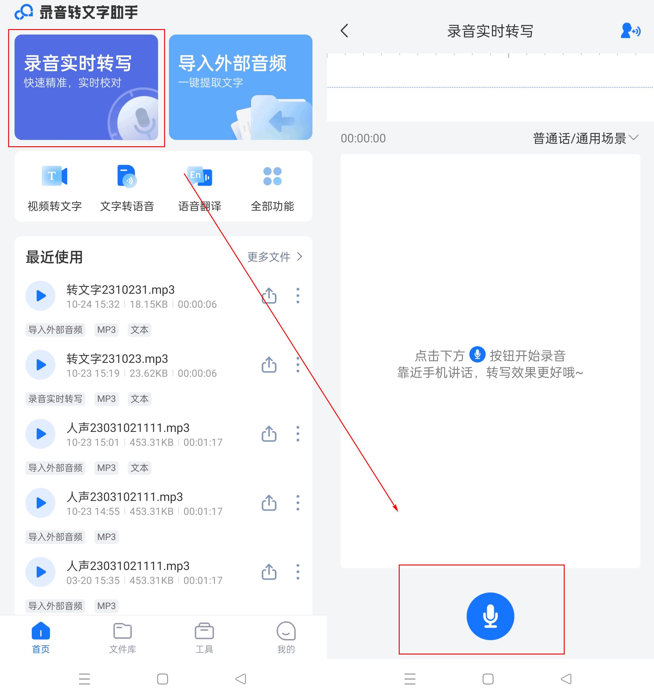 打开App,选择「录音实时转写」功能,点击底部麦克风按钮开始录音,说完话后自动生成文字,还能选择“普通话/英语/粤语”等语言模式。