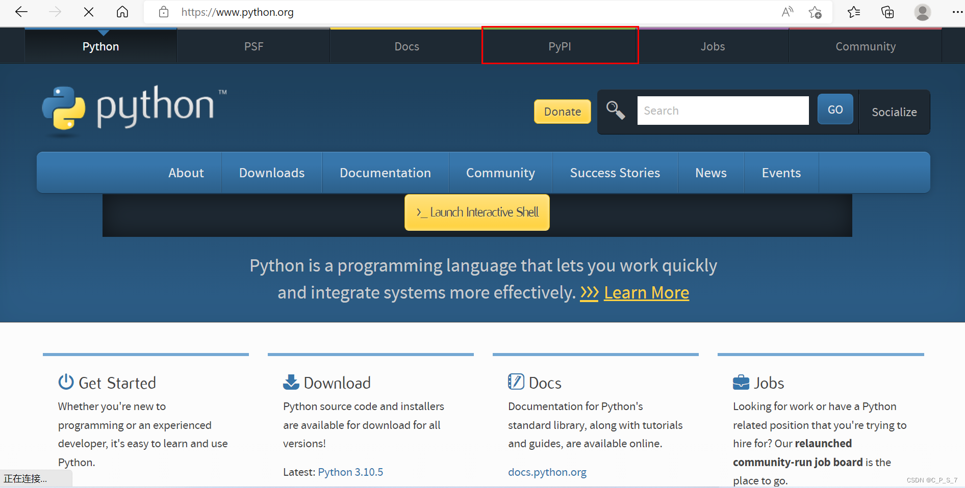 打开Python官网( https://www.python.org),点击最上方PyPi