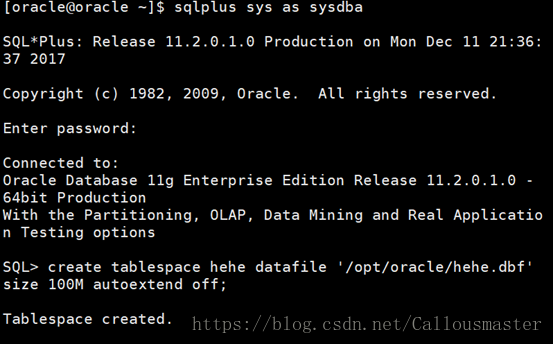 案例:创建表空间hehe,存储文件放在/opt/oracle/目录下,限制使用100M,并且不能自动扩展大小