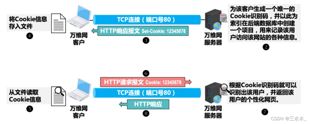 HTTP 协议中的 Cookie 包括 Web Cookie 和浏览器 Cookie,它是服务器发送到 Web 浏览器的⼀ ⼩块数据。服务器发送到浏览器的 Cookie,浏览器会进⾏存储,并与下⼀个请求⼀起发送到服务器。通 常,它⽤于判断两个请求是否来⾃于同⼀个浏览器,例如⽤户保持登录状态。