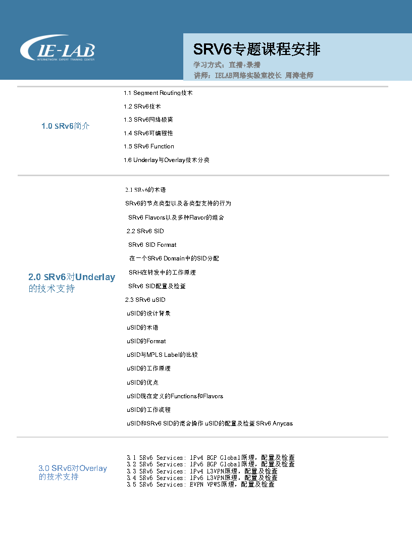 【IELAB网络实验室】掌握SRv6技术有多容易?这个专题了解一下 学网络,就在IE-LAB国内高端网络工程师培养基地关于Segment Routing这个技术相信大家都已经很熟悉了,而对于SRv6技术的了解和掌握,不少人还是处于迷茫的状态。SRv6专题循环开课中,授课讲师:IELAB网络实验室校长周涛老师学习方式:在线直播+录播课程+实验指导+答疑SRv6课程具体需要学习哪些内容?此外,SRv6专题也是IE-LAB网络实验室周涛老师主讲的思科SP运营商方向全栈班课程其一,总计11个专题,全栈课程可满足不同学习需求的网络工程师,大家可以根据自..
